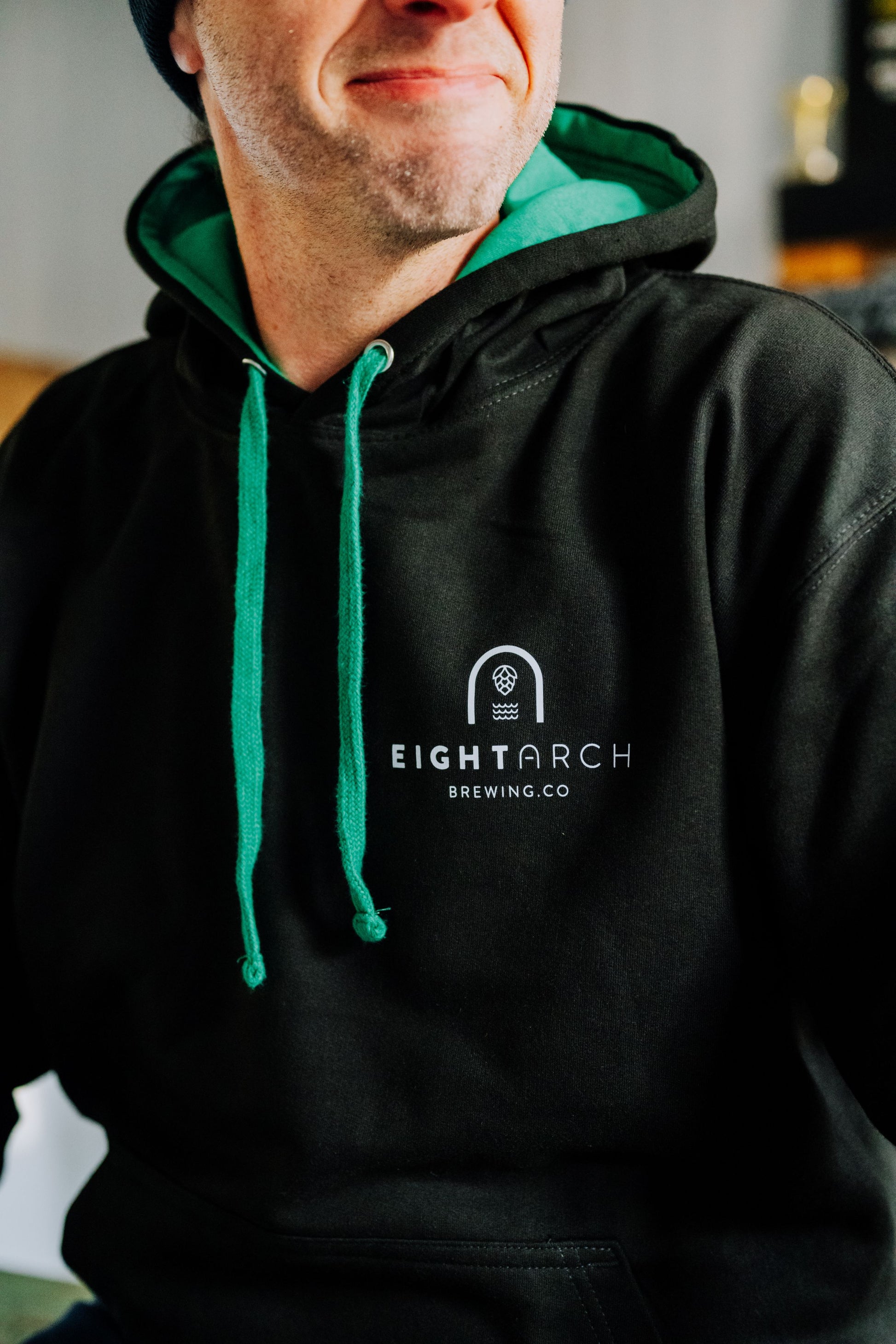 Eight Arch logo front and rear printed black hoodie with green internal hood.